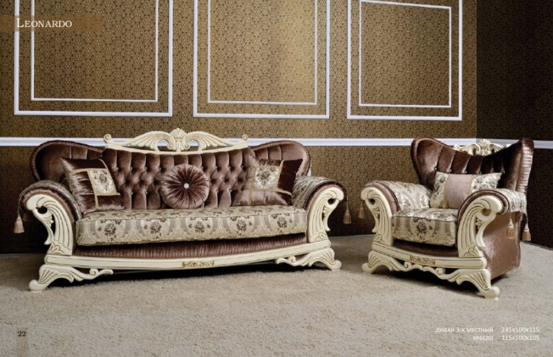 Мягкая мебель серии "Leonardo" поражает своим царственным великолепием, принося самые важные акценты в оформление антуража гостиной комнаты. Во многом облик такой мебели дополняет изысканные накидки на подлокотниках, резные деревянные вставки и множество роскошных тканевых обивок.
