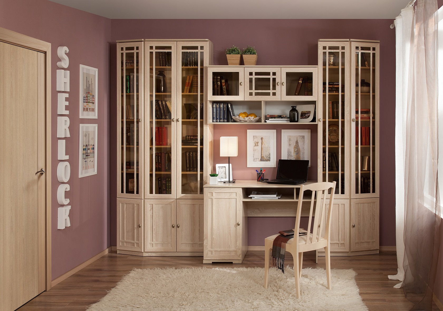 Библиотека выполнена в одном декоре и стиле с гостиной SHERLOCK — Дуб Сонома. Поэтому из её модулей Вы можете организовать небольшое функциональное рабочее место даже в гостиной.