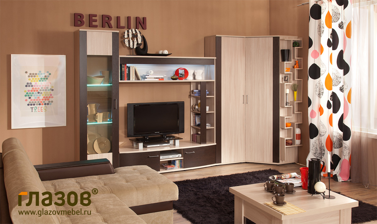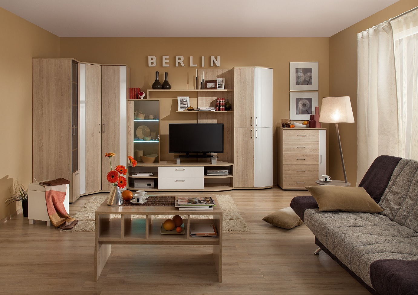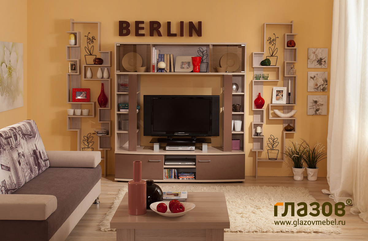 Если в гостиной Вы хотите предусмотреть не только место для ТВ, но и для хранения одежды, посуды, памятных подарков, предлагаем рассмотреть вариант компоновки модулей коллекции BERLIN , необходимых по функционалу. Широкая линейка модулей гостиной BERLIN удовлетворит запросы самых требовательных покупателей.