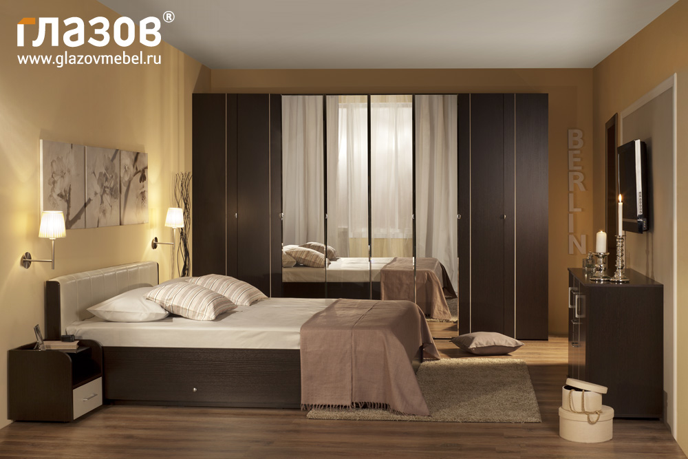Спальня BERLIN в декоре Венге с элементами из контрастной белой кромки смотрится стильно и модно. Благородная фактура и неповторимые оттенки венге подчеркивают эргономичность модулей.
