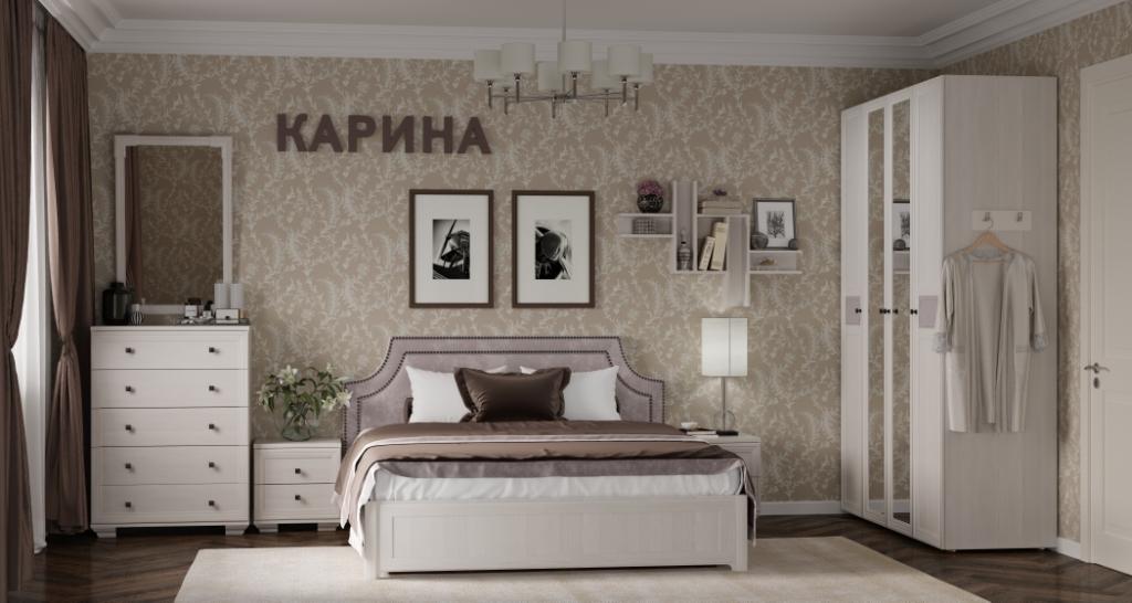 Новинка - роскошная спальня Карина . Нежный велюр, резной силуэт изголовья, эффектные рельефные вставки - главные аккорды новой мебельной коллекции КАРИНА в декоре Бодега Светлый.