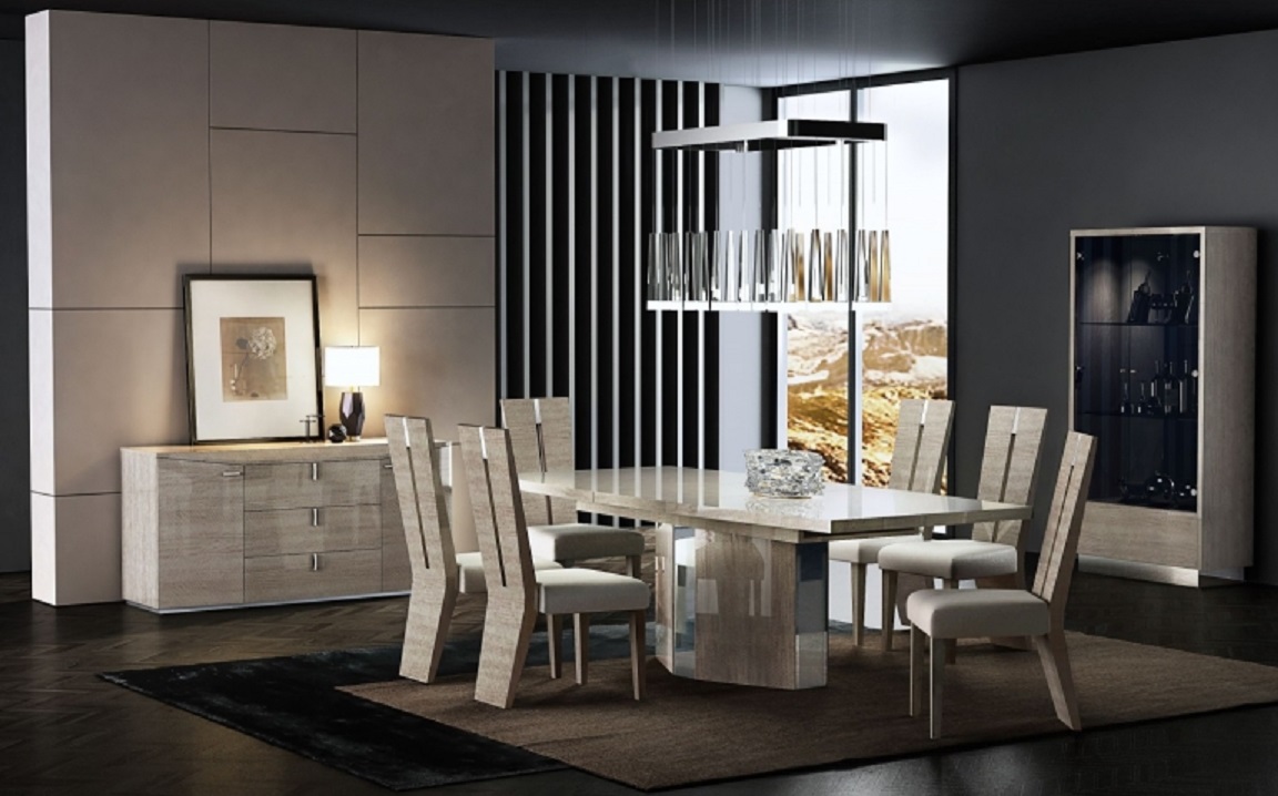 Столовая Daphne выполнена в современном стиле, который визуально можно причислить и к стилю Арт-деко из-за интересной формы обеденного стола, стульев и комода.