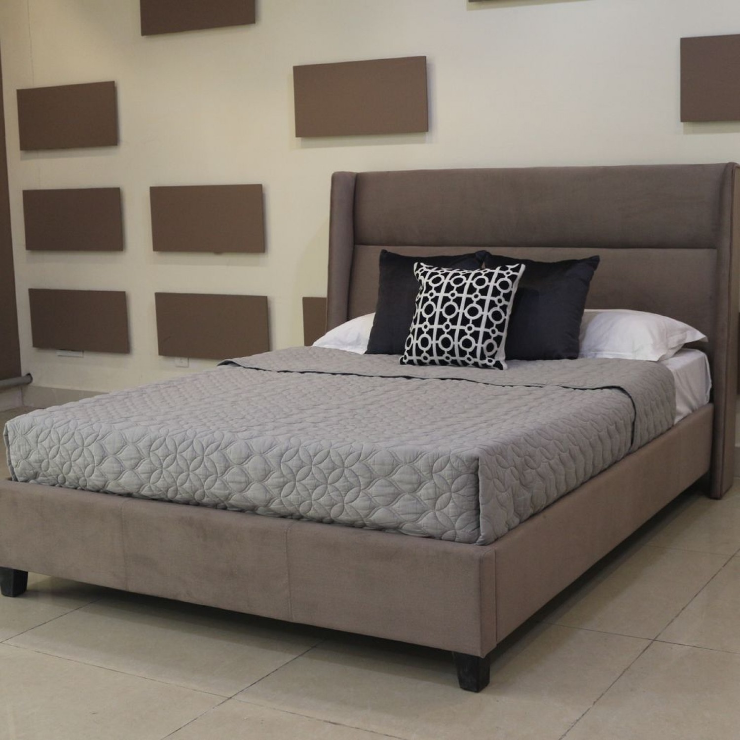 Спальня Kourtney выполнена в современном стиле, который визуально можно причислить и к стилю Арт-деко из-за интересной формы изголовья кровати, прикроватных тумбочек и комодов.