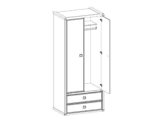 Двуххстворчатый шкаф Анрэкс Магеллан 2DG2S подойдет для спальни или детской комнаты, обставленной в винтажном стиле, где необходимо создать систему хранения одежды. Шкаф содержит: платяное отделение, включающее верхнюю полку, штангу для вешалок и два выдвижных нижних ящика. Корпус и фасад модели изготовлены из высококачественной ЛДСП (ламинированной древесно-стружечной плиты), а для отделки декоративных элементов фасада (планки) использована древесно-волокнистая плита МДФ, дополнительная обработка торцов меламиновой и ПВХ-кромкой защитает изделие от проникновения влаги, возможных повреждений и сколов.