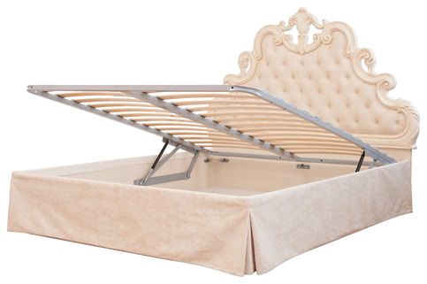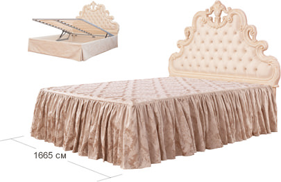 Украшением считается не только изголовье, но и декоративно выточенные ножки. Коллекция тканей Шиншилла – нежнейший велюр с различным дизайном. Ткани присуща невероятная гладкость и бархатистая поверхность. Подъёмный механизм и покрывало приобретается отдельно.