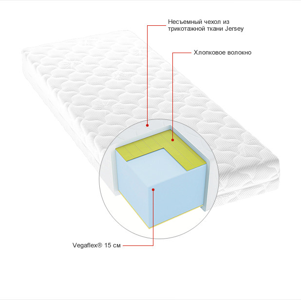 Беспружинный матрас в удобной рулонной упаковке. В основе лежит монолит из современного синтетического материала Vegaflex©, естественная упругость которого гарантирует полноценный ортопедический эффект. Чехол из ткани отлично впитывает влагу, позволяя коже полноценно дышать.