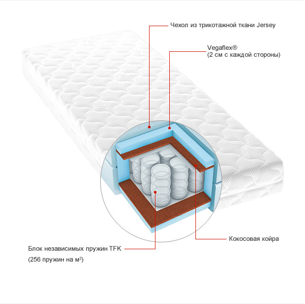 Ìàòðàñ ñ ãàðìîíè÷íûì ñî÷åòàíèåì ïðèðîäíûõ è ñèíòåòè÷åñêèõ ìàòåðèàëîâ. Ñëîè êîêîñîâîé êîéðû è èííîâàöèîííîãî ìàòåðèàëà Vegaflex©, ñèììåòðè÷íî ðàñïîëîæåííûå ïî îáå ñòîðîíû áëîêà íåçàâèñèìûõ ïðóæèí TFK, ïðèäàþò ñèñòåìå îïòèìàëüíóþ ñðåäíþþ æåñòêîñòü, äåëàÿ ìàòðàñ ïîèñòèíå óíèâåðñàëüíûì ðåøåíèåì.