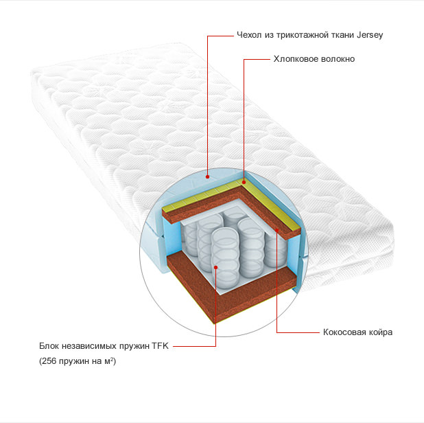 Два симметричных слоя кокосовой койры в сочетании с блоком независимых пружин TFK наделают систему неповторимой комфортной жесткостью, создавая практически идеальное решение для любителей твердой солидной постели.