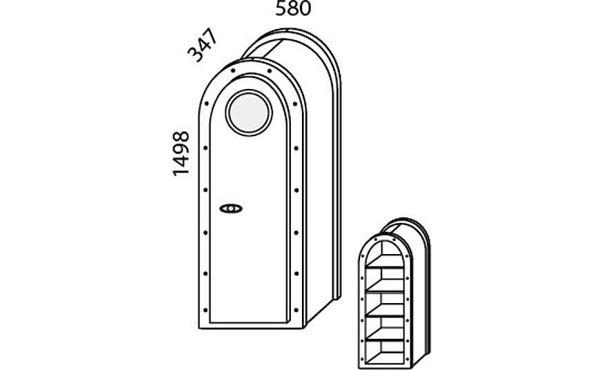 Øêàô Í-8 ñ äâåðêîé è ÷åòûðüìÿ ïîëêàìè ñî ñêðóãëåííûì âåðõîì øêàôà è äâåðêè. Ôàñàä äâåðêè øêàôà èìååò äåêîðàòèâíóþ âñòàâêó èç ñòåêëà â âèäå èëëþìèíàòîðà.