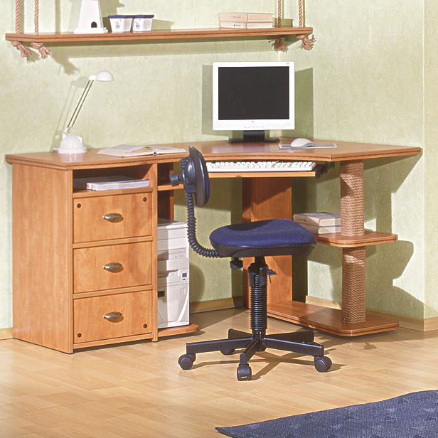 Стол угловой Н-20Л с тумбой с нишей и тремя выдвижными ящиками, расположенной слева, с открытой полкой, расположенной справа, и полкой для клавиатуры компьютера. Стойка открытой полки стола декорирована пеньковым канатом. Рекомендуем дополнительно приобрести полку навесную Н-17.