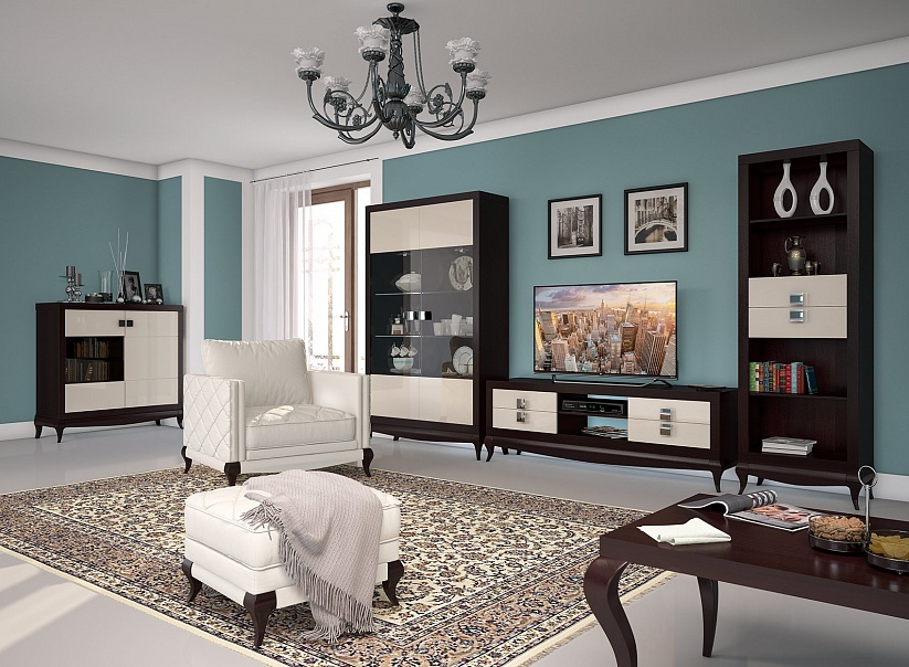 Сокращенная версия тумбы под ТВ Лавиано подойдет для современных небольших гостиных. Фасад выдвижных ящиков из МДФ, покрытый многослойным лаком и цветом Американский орех, эффектно контрастирует с корпусом и фигурными опорами из натурального дерева цвета Венге.