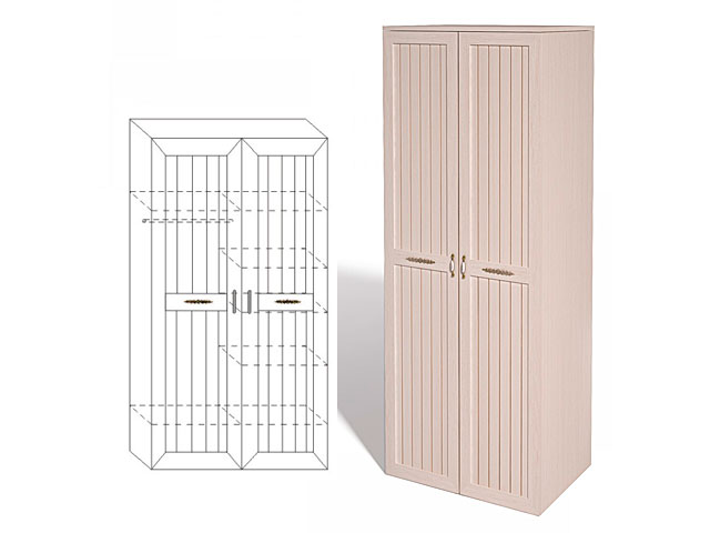 Шкаф для платья и белья 2 х дверный ИД 01.61 , имеет следующие габаритные размеры: Г588хШ866хВ2243мм. В шкафу за распашными дверями слева расположена штанга для хранения одежды повешанной на плечики, справа расположены полки для вещей. Фасад выполнен в цвете «Дуб млечный» с поперечной планкой МДФ цвета «Дуб млечный» украшеной декоративной бронзовой накладкой. Дверцы шкафа украшены классическими бронзовыми ручками с фарфоровыми вставками, что придает мебели дополнительную изысканность.