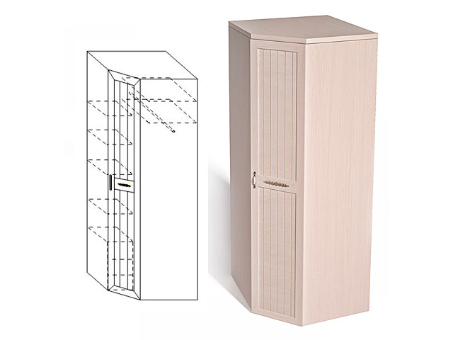 Шкаф угловой ИД 01.122, имеет следующие габаритные размеры Г881хГ881хГ2243мм, в шкафу с правой стороны расположена штанга для хранения одежды на плечиках, с левой стороны четыре полки и два выдвижных ящика. Фасад выполнен в цвете «Дуб млечный» с поперечной планкой МДФ цвета «Дуб млечный» украшеной декоративной бронзовой накладкой. Дверь шкафа украшена классической бронзовой ручкой с фарфоровой вставкой, что придает мебели дополнительную изысканность.