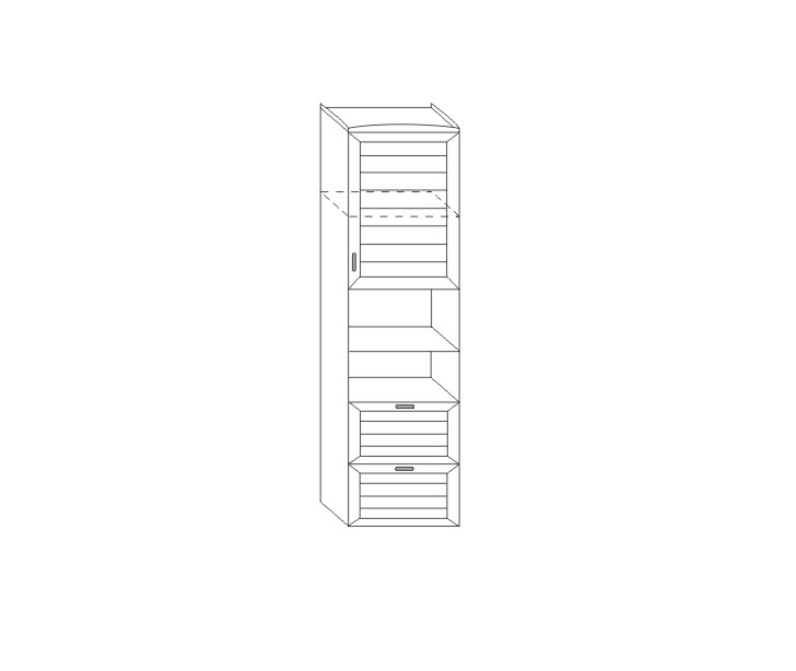 Шкаф-пенал для книг ИД 01.81, имеет следующие габаритные размеры Г450хШ480хВ2199мм. Корпус шкафа изготовлен из ЛДСП класс Эмиссии Е-1 цвета ноче гварнери, фасады шкафа изготовлены из рамочного профиля МДФ цвет орех, вставка типа жалюзи цвет штрих-лак. В шкафу имеется две открытых полки для книг или игрушек, в верху за распашной дверью расположена полка, с низу два вместительных выдвижных ящика на роликовых направляющих.