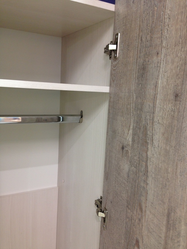 Внутреннее наполнение шкафа: слева две двери - полка и штанга для одежды, справа - бельевые полки.