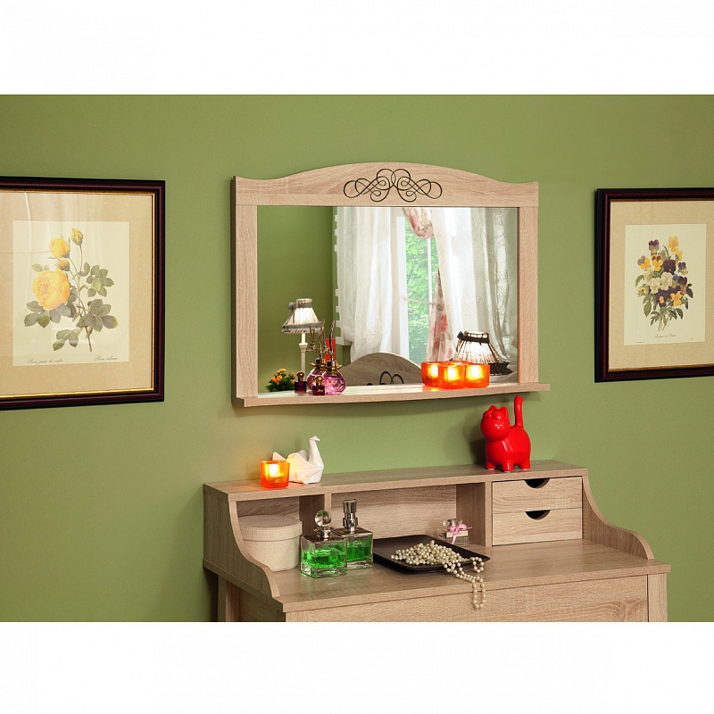 Изысканное 11 Зеркало навесное с витиеватым узором, цвет которого подбирается к декору кроватных опор, имеет два варианта установки полочки для аксессуаров. Нижнюю планку можно использовать в качестве функциональной полки или собрать как дополнительный декоративный элемент симметрично верхней планке. Такое зеркало можно навесить на стену как прямо, так и под небольшим наклоном.