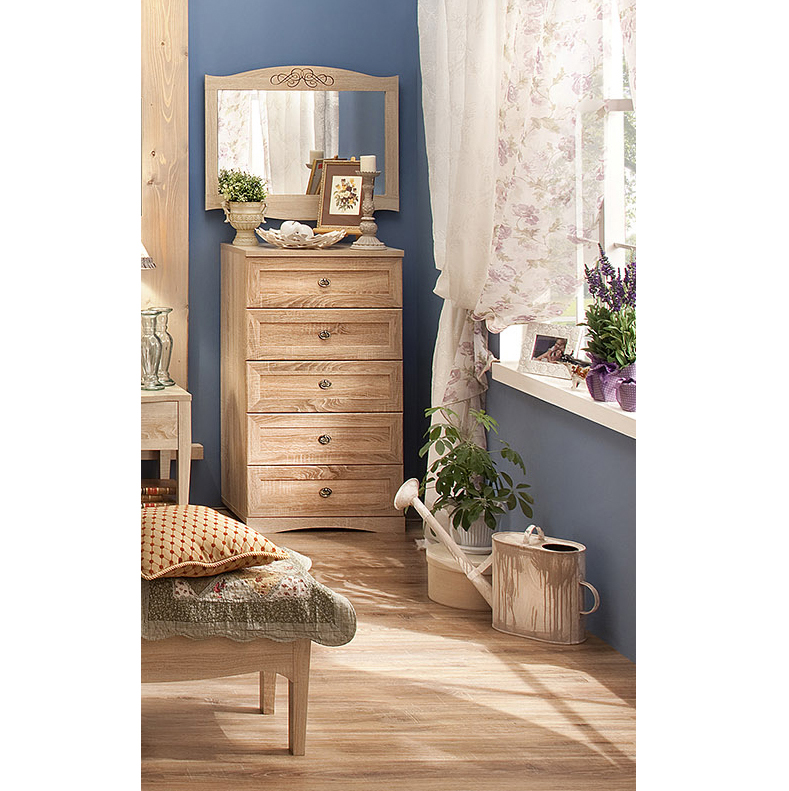 Высокий и узкий 12 Комод экономит место в спальне без ущерба для вместительности. Особенностью комода является декоративный цоколь в стиле Прованс. Ящики глубиной 16 см на шариковых направляющих полного выдвижения, что позволит максимально использовать полезную площадь. Навесив над комодом зеркало в раме, получаем функциональное место для нанесения макияжа, которое идеально подойдет по габаритам для маленькой спальни.