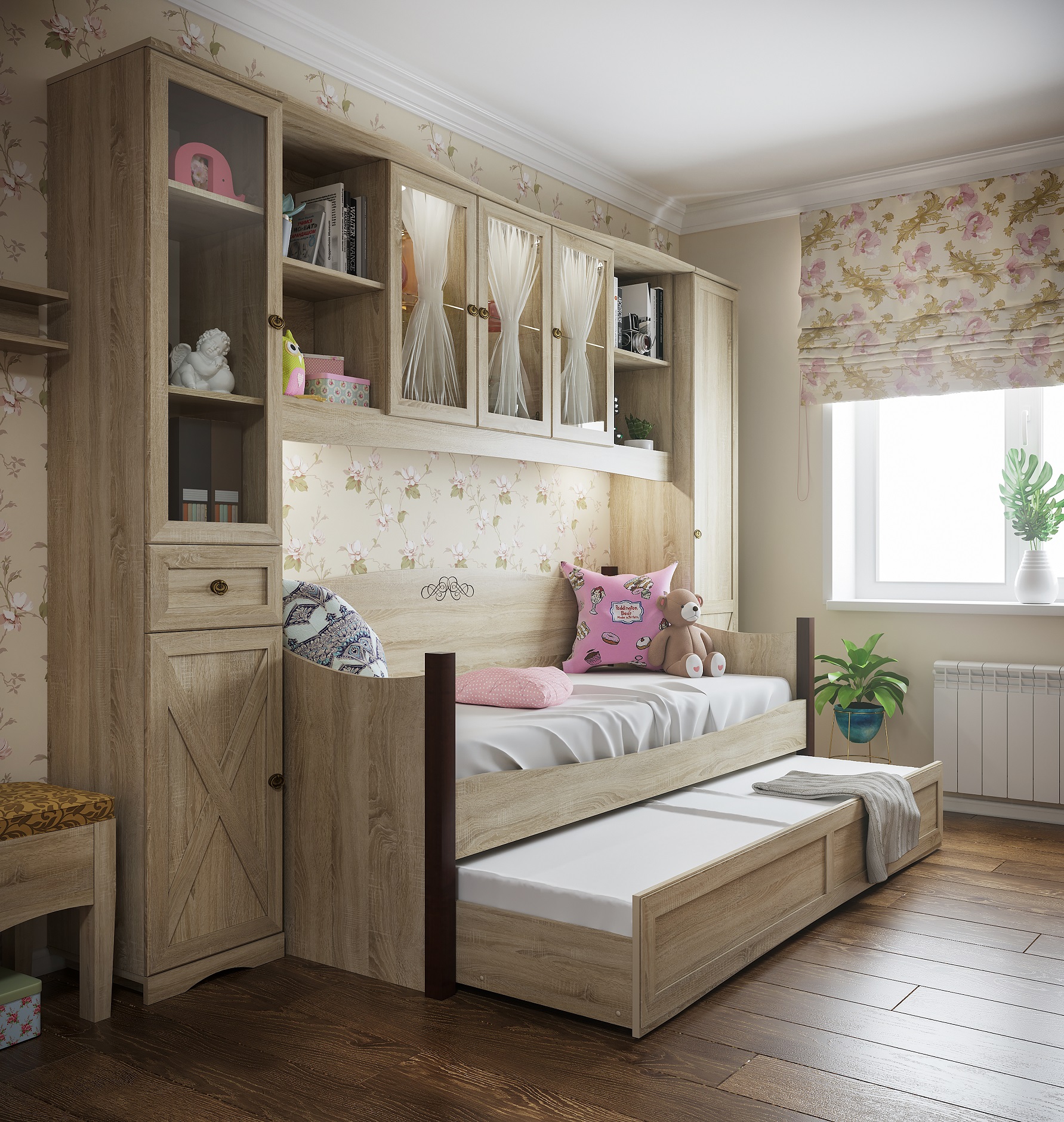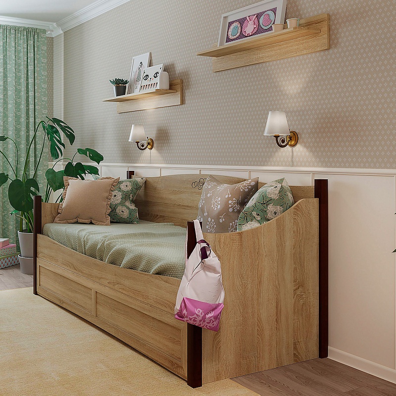Фигурное изголовье кровати ADELE выгодно подчеркивается толстыми (50 мм) кроватными опорами из МДФ. Изящный вензельный рисунок шоколадного цвета в соответствии с цветом опор нанесен с помощью УФ-печати. Данный метод нанесения гарантирует экологичность, долговечность использования и устойчивость к истиранию.Дно спального места кровати — из ЛДСП. Оно усилено специальными ребрами жесткости из фанеры 18 мм и рассчитано на нагрузку до 80 кг. Это позволяет пользоваться кроватью даже школьникам старших классов. На толстые опоры из контрастного профиля МДФ можно набросить сумку или рюкзак. Размер матраса для основного спального места: 80*200 см, высотой от 15 см. Размер матраса для дополнительного спального места: 80*195 см, высотой от 18 см. Особенности коллекции ADELE: - Декоративная раскладка на фасадах, - Шариковые направляющие на ящиках, - Фигурное изголовье с УФ - печатью.