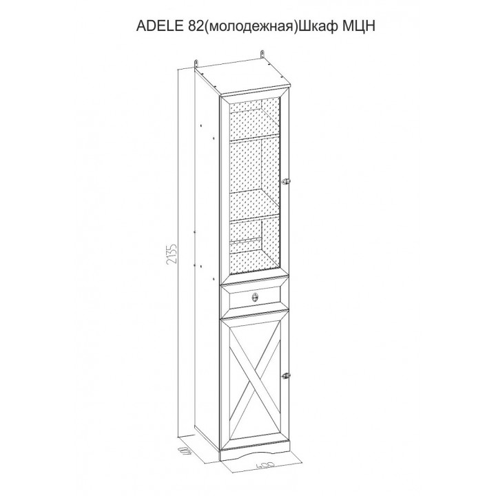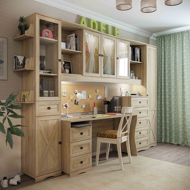 Высокий шкаф для хранения идеально подходит для детской комнаты, в которой скапливается множество разнообразных и таких нужных вещей. В верхний застекленный фасад можно убрать книги, настольные игры, фотографии и любимые игрушки. В выдвижном ящике на шариковых направляющих легко хранить разные мелочи и аксессуары. Нижний глухой фасад, декорированный Х-образной раскладкой из профиля МДФ, скрывает нишу с полочкой, регулируемой по высоте. Верхний и нижний фасады можно перевесить на левую и на правую стороны. Шкаф обязательно крепится к стене за подвесы и межсекционной стяжкой с другими шкафами в наборе.