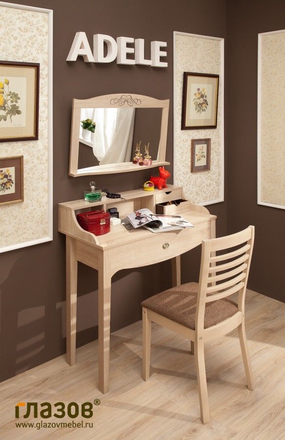 Изящный 10 Стол туалетный с широким выдвижным ящиком глубиной 120 мм, двумя маленькими ящичками и надстройкой позволит разместить все необходимое: косметику, средства для укладки, бижутерию и аксессуары. Корпус выдвижных ящичков на столешнице выполнен в декоре Орех шоколадный, они не имеют направляющих, повторяя своим декором и конструкцией черты, характерные для мебели из дерева. Нижний ящик на шариковых направляющих полного выдвижения. Это позволит максимально использовать полезную площадь ящика.