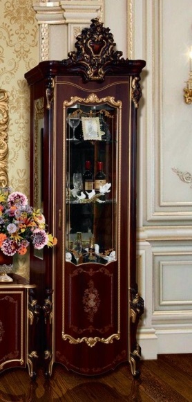 Шкаф 1-дверный ГШ-01 Шейх станет роскошным дополнением интерьера вашей гостиной. За распашной дверью находятся четыре полки, две из которых стеклянные, предназначены для фамильного фарфора, роскошных наборов посуды, хрусталя и аксессуаров застолья. Аристократический дизайн, комфортная роскошь форм и разнообразие мебели Шейх - основа изысканного уюта.