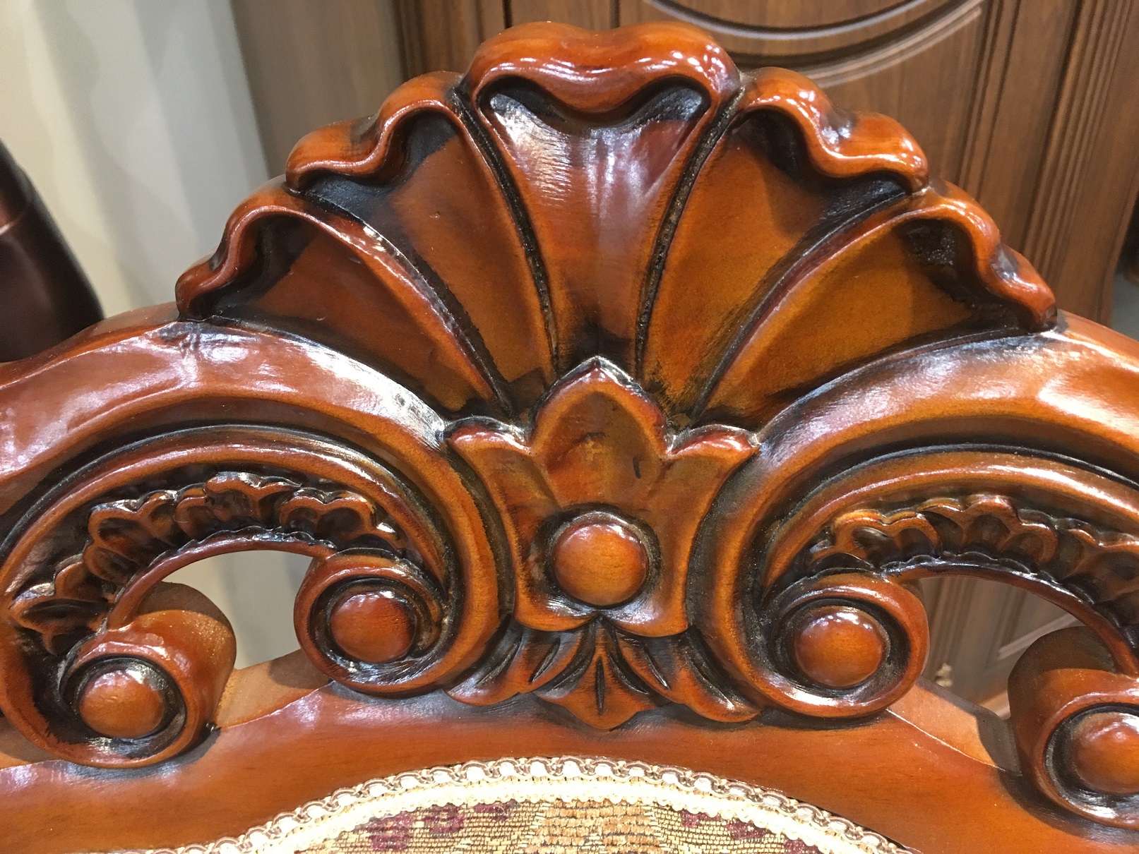 Мягкий стул без подлокотников, выполненный в классическом стиле. Благодаря элегантному внешнему виду, он не только добавит роскоши в интерьер Вашей квартиры, но и подчеркнет статус владельца. Каркас модели, представленный, высокой спинкой, а также четырьмя резными ножками, изготовлен из массива гевеи и сверху покрыт лаком. По центру спинка декорирована богатой резьбой. Сиденье стула мягкое и обито износостойкой тканью. Данный стул будет великолепно смотреться в комплекте с любым столом из натурального дерева.