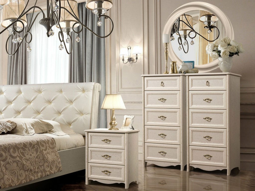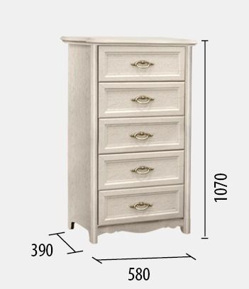 Компактный комод с пятью ящиками отлично подойдёт для небольшой спальни. Светлый оттенок и лаконичный дизайн позволяют комбинировать этот комод с предметами мебели других стилей для создания уникального интерьера. Заметной деталью в дизайне являются ручки. Они выглядят аккуратно и внешне немного напоминают старинные. Такая деталь украшает комод и делает его запоминающимся.