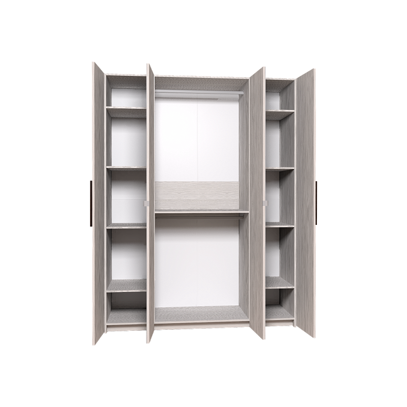 Вместительный шкаф, благодаря современным планировкам квартир, всегда найдет свое место в спальне. Внутреннее наполнение четырехдверного шкафа из коллекции Карина продумано для гардероба семейной пары: две стационарные штанги длиной 777 мм позволят развесить мужскую и женскую одежду раздельно, на боковых стеллажах с регулируемыми полками разместятся вещи, которые можно складывать. Рамочный фасад украшен профилем МДФ изысканной конфигурации и декоративной вставкой, обтянутой бархатной тканью приглушенного оттенка. Рельеф на вставке гармонирует с изголовьем кровати спального гарнитура Карина. Два центральных фасада с зеркалами в полный рост позволят рассмотреть свое отражение без помех. Шкаф крепится к стене за подвесы. Регулируемые опоры позволят компенсировать незначительные неровности пола. Фасады перенавешиваются, их можно установить в том порядке, который вам нравится больше всего. Видимую боковину шкафа можно украсить с помощью стеллажа Twist или придать ей функциональности, навесив вешалку Mini с металлическими крючками.