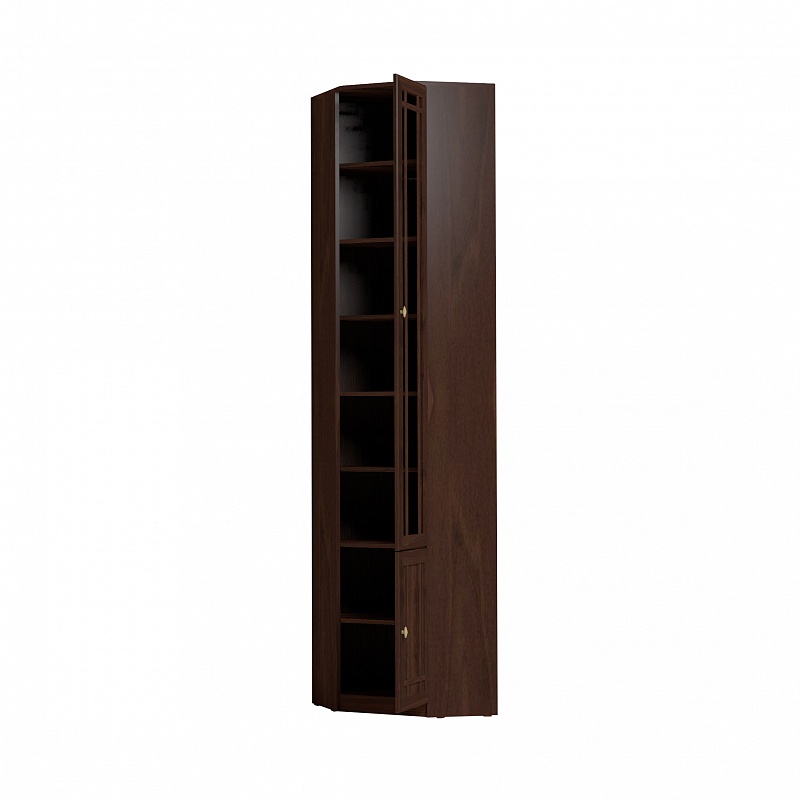 Высокий книжный шкаф для угловой композиции домашней библиотеки. Можно установить в комнату с высотой потолка не менее 240 см. Широкие треугольные полки позволят хранить в библиотеке папки с документами, шкатулки с семейным архивом и фотографиями. Высота полок во всех шкафах для книг регулируется, для этого необходимо только установить полкодержатели на нужной высоте в подготовленные отверстия. Это позволит поставить на полки книги и альбомы разного формата. Тонированное стекло защищает книги от вредного воздействия солнечных лучей и убережет их от пожелтения. Двери не перенавешиваются. Книжный шкаф обязательно крепится к стене за подвесы и межсекционной стяжкой с другими шкафами в наборе.