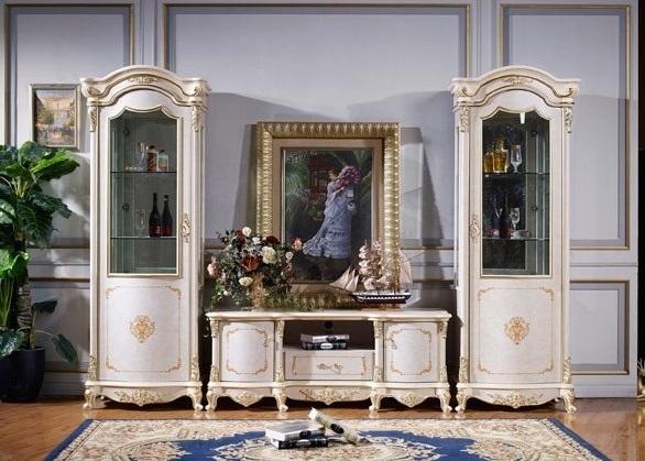 Витрина практически полностью выполнена из шпонированного МДФ. Ее корона, фасад, а также ножки декорированы искусной лепниной и позолотой.