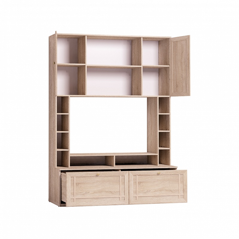 Легкие рамочные фасады модулей коллекции SHERLOCK декорированы переплетом из МДФ, что дополнительно подчеркивает строгость форм и классический стиль коллекции. Легкий и небольшой по габаритам 1 Шкаф МЦН вмещает телевизор диагональю до 44”: высота ниши 725 мм, ширина - 1154 мм. В боковых стеллажах храните декоративные интерьерные мелочи. Глубина нижних выдвижных ящиков - 400 мм. Они комплектуются шариковыми направляющими, которые обеспечивают им минимальный люфт и высокую прочность. Один ящик выдерживает нагрузку до 20 кг. Подставку на тумбе под ТВ можно закрепить над нишей, как дополнительные вместительные полки.