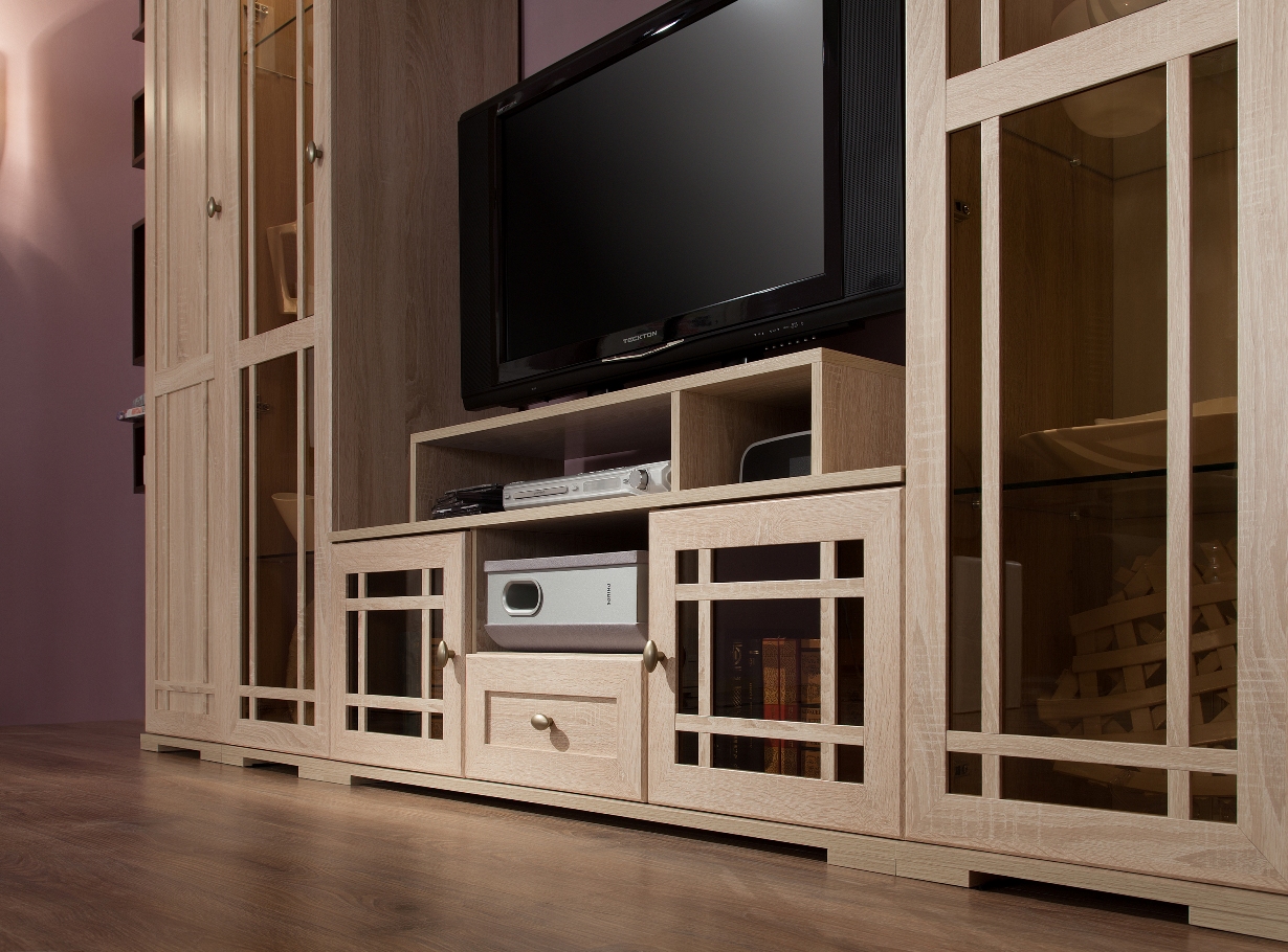 Неглубокая ТВ Тумба в классическом стиле позволит аккуратно разместить в гостиной всю видео и аудио аппаратуру. Центральная ниша шириной 370 мм. Выдвижной ящик глубиной 160 мм на шариковых направляющих можно не устанавливать, чтобы увеличить размер ниши в высоту. Если нужно поднять телевизор повыше, используйте дополнительный модуль - Sherlock 17 Подставка . Эта Тумба доступна по услуге Ширина ВРАЗМЕР . Это значит, что ее ширину можно увеличить или уменьшить на 150 мм с шагом в 1 мм, чтобы она максимально точно разместилась в размерах комнаты.