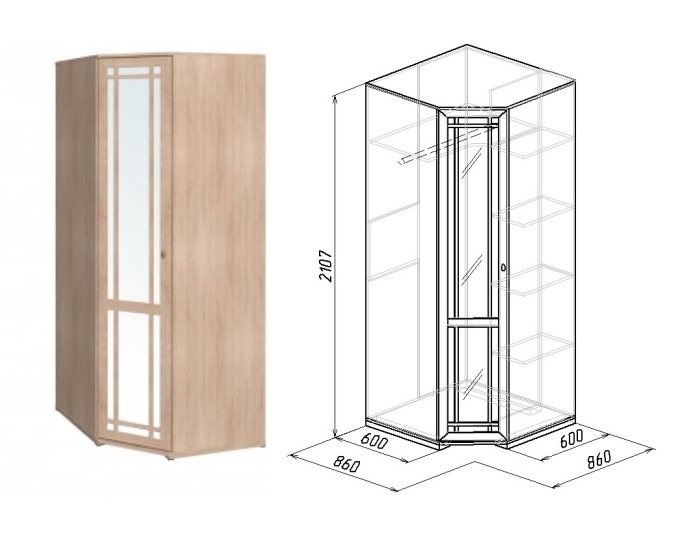 Используйте углы в комнате рационально! Угловой шкаф оснащен стационарной штангой длиной 81 см, полочками для белья и автоматической подсветкой, которая включается, если шкаф открыт. Этот Шкаф комплектуется Фасадом Зеркало или Стандарт ( Sherlock 10 Шкаф угловой + ФАСАД Стандарт ), с зеркальной дверью или глухой соответственно. Фасад углового шкафа изготавливается только в исполнении «левый» (определяется по расположению петель). По своим габаритам угловой шкаф подходит для компоновок глубиной 590 мм. Например, поставьте рядом с ним Sherlock 14 Полка угловая .