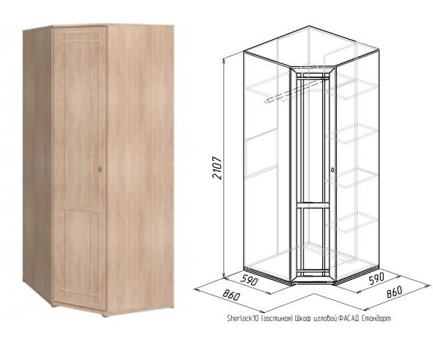 Используйте углы в комнате рационально! Угловой шкаф оснащен стационарной штангой длиной 81 см, полочками для белья и автоматической подсветкой, которая включается, если шкаф открыт. Этот Шкаф комплектуется Фасадом Стандарт или Зеркало ( Sherlock 10 Шкаф угловой + ФАСАД Зеркало ), с глухой дверью или зеркальной соответственно. Фасад углового шкафа изготавливается только в исполнении «левый» (определяется по расположению петель). По своим габаритам угловой шкаф подходит для компоновок глубиной 590 мм. Например, поставьте рядом с ним Sherlock 14 Полка угловая .