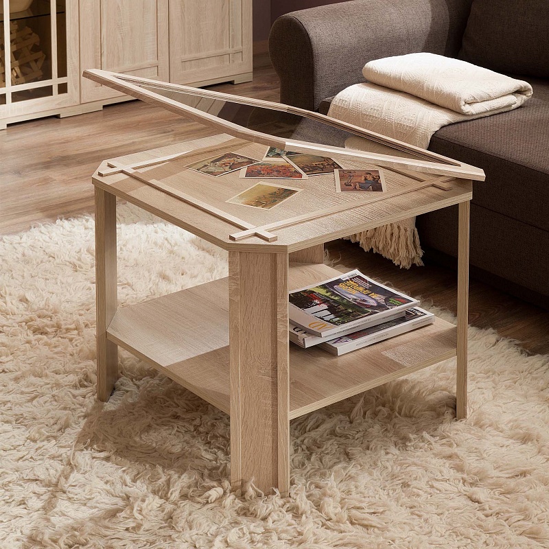 Маленький журнальный столик можно декорировать самостоятельно, благодаря откидной столешнице на шарнирных петлях. Например, сложить редкие открытки или фотографии любимых.