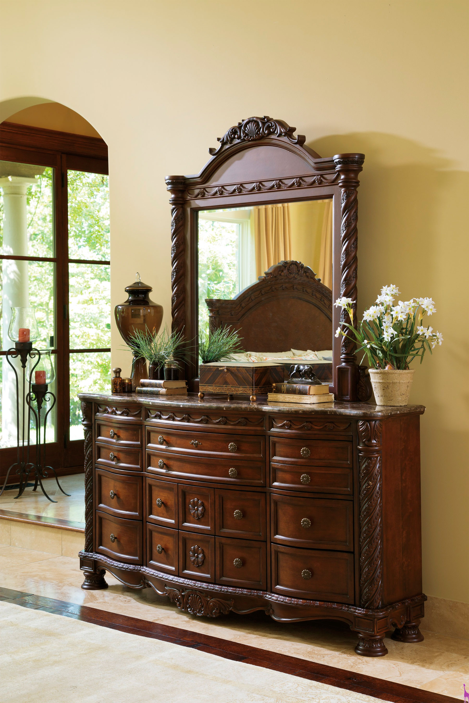 Великолепный комод North Shore без зеркала, излучающий роскошь, выполнен в классическом стиле и будет прекрасно смотреться в спальной комнате с соответствующим интерьерным решением. Комод производится мебельным брендом Ashley Furniture. Данная модель B553-131 изготовлена из шпона, материала который отличается высокими качественными и экологичными характеристиками. Четыре невысокие фигурные ножки поддерживают комод, состоящий множества выдвижных ящиков, отличающихся по размеру. Фигурный царговый пояс объединяет ножки. Мраморная столешница также пригодна для эксплуатации, на нее можно поставить декоративные предметы. Фасад выполнен в форме волны. Боковые углы в передней части сделаны в виде колонн. Комод украшает элегантная фурнитура, резьба и изящная лепнина.