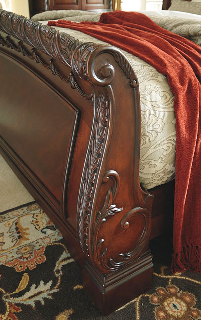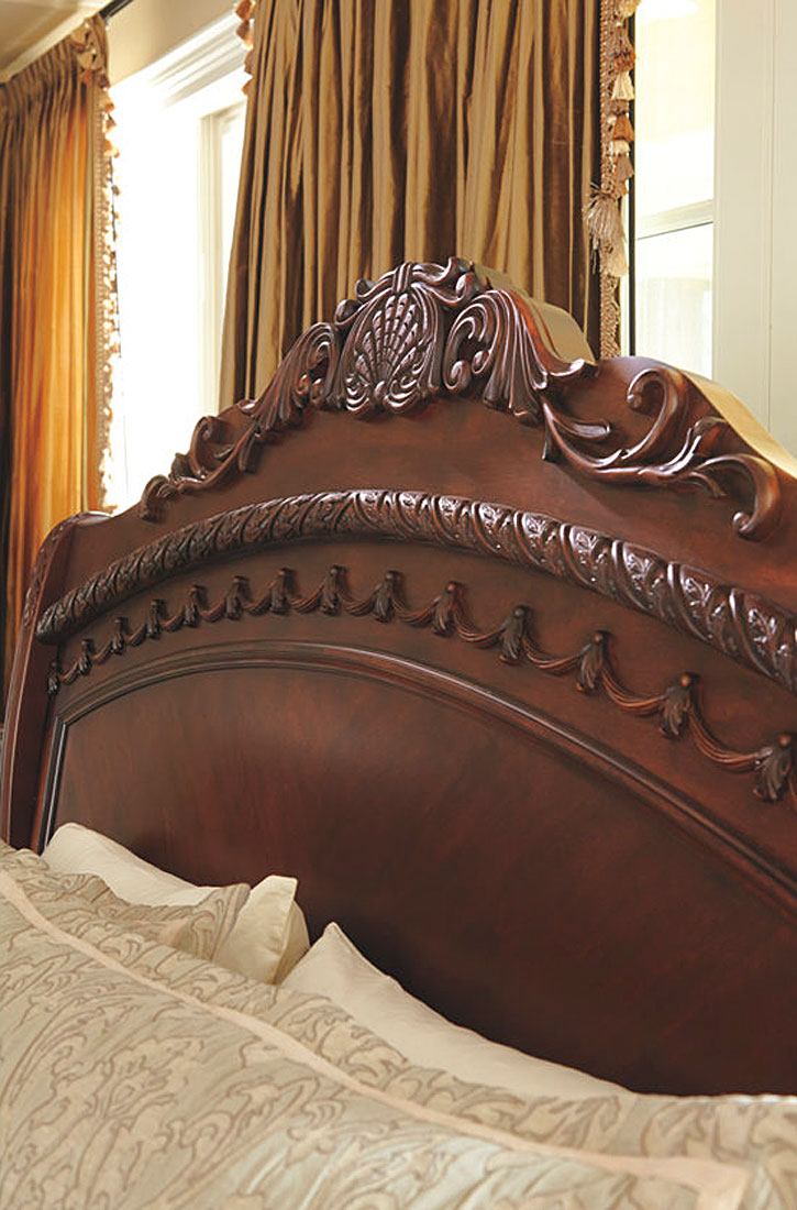 Роскошная кровать из коллекции North Shore, принадлежащей мебельной фабрике Ashley Furniture, станет не только комфортным местом отдыха, но и главным украшением спальной комнаты, интерьер которой выдержан в классическом стиле. Данная модель изготовлена с использованием натурального шпона. Высокое изголовье с выступающими боковинами и устремленной вверх центральной частью декорировано великолепной резной лепниной с растительной тематикой. Изножье также украшает оригинальная резьба и лепнина.
