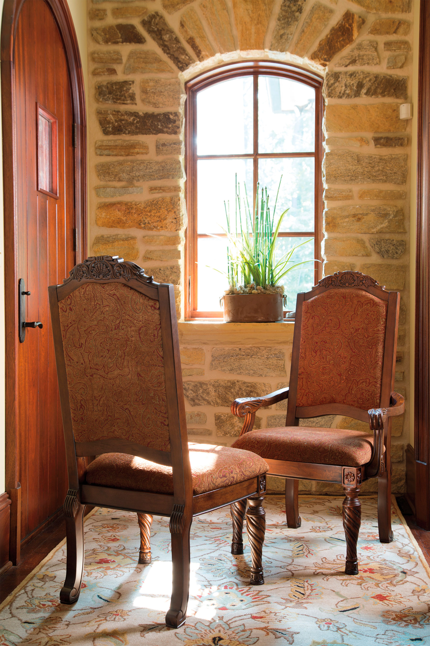 Ashley Furniture - фабрика, успешно занимающаяся производством мебели на протяжении многих лет, создала великолепный стул North Shore, который станет отличным дополнением в гостиной или столовой с классическим или современным интерьером. Для данной модели D553-02 были выбраны качественные материалы, такие как шпон и ткань. Ткань с растительным орнаментом используется в качестве обивки для мягких сидения и спинки. Верх спинки декорирован искусной резьбой. Передние ножки прямые, напоминают по форме узкую вазу, а задние слегка выгнуты. Также имеется прямой царговый пояс.