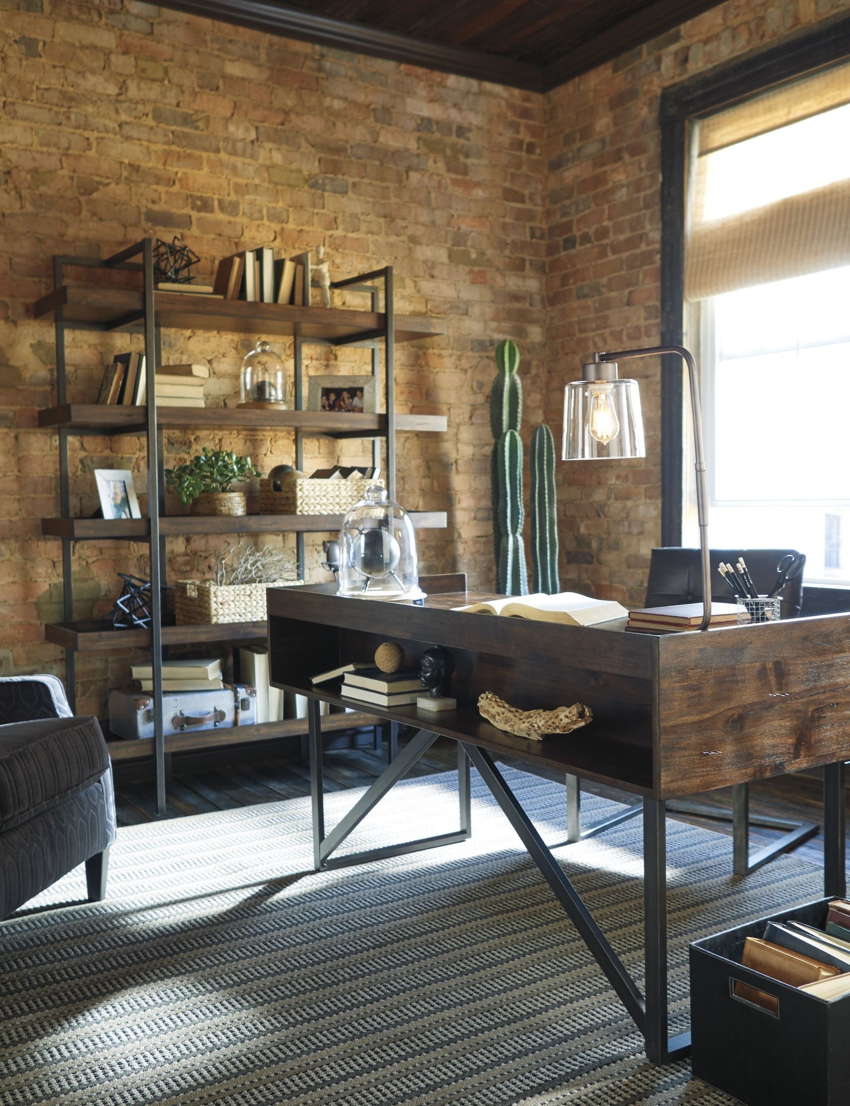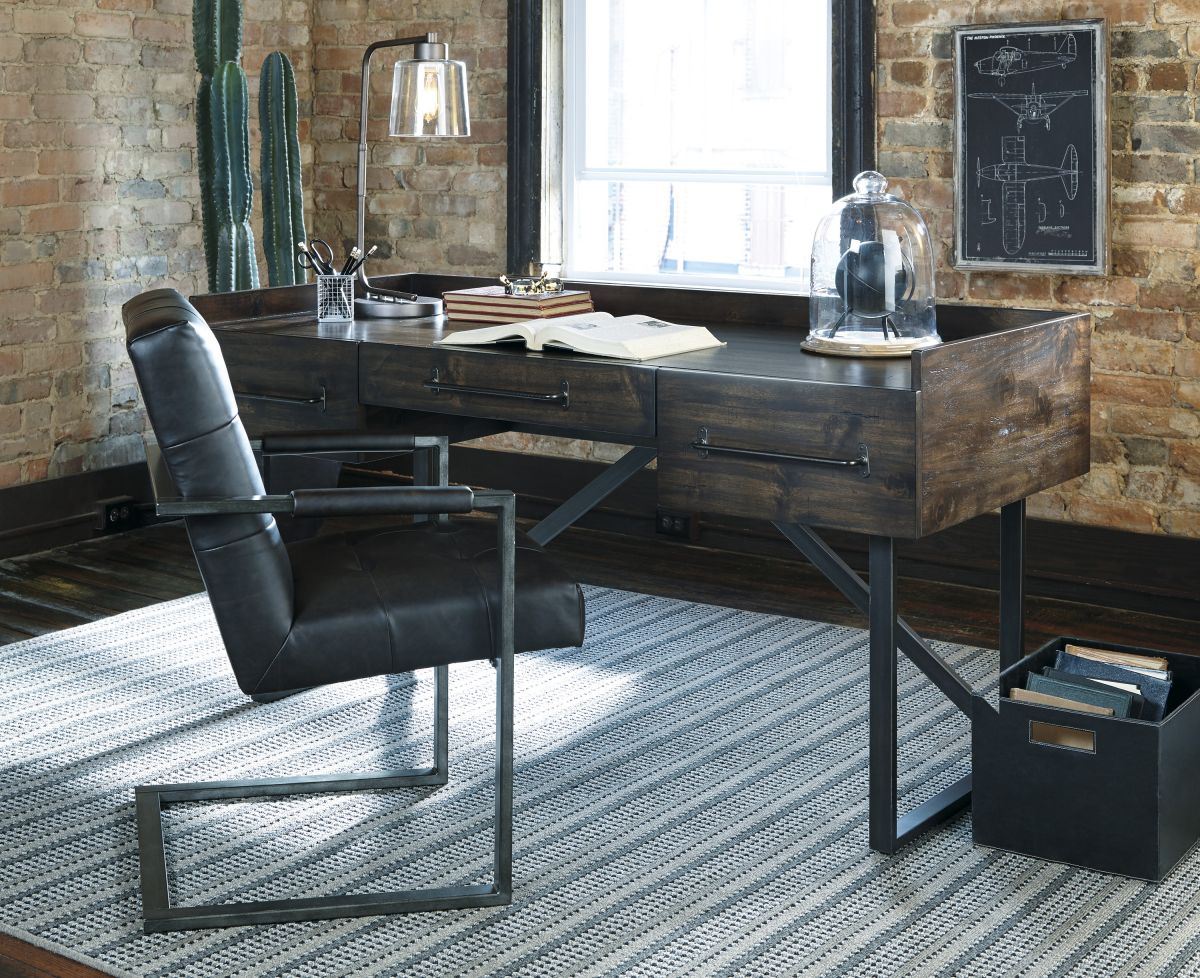 Письменный стол Starmore H633-27 выполнен из дерева и металла, материалов которые отличаются надежностью и долговечностью. Данная модель прекрасно впишется в современный интерьер кабинета. Высокое качество стола подтверждает и фабрика, выпустившая данную продукцию - Ashley Furniture. Стол представляет собой металлическую конструкцию черного цвета, которая служит опорой. Столешница стола оснащена бортиками по бокам и дальнему краю. Под столешницей в передней части расположены три выдвижных ящика с соответствующей фурнитурой, а в противоположной части имеет открытая полка.