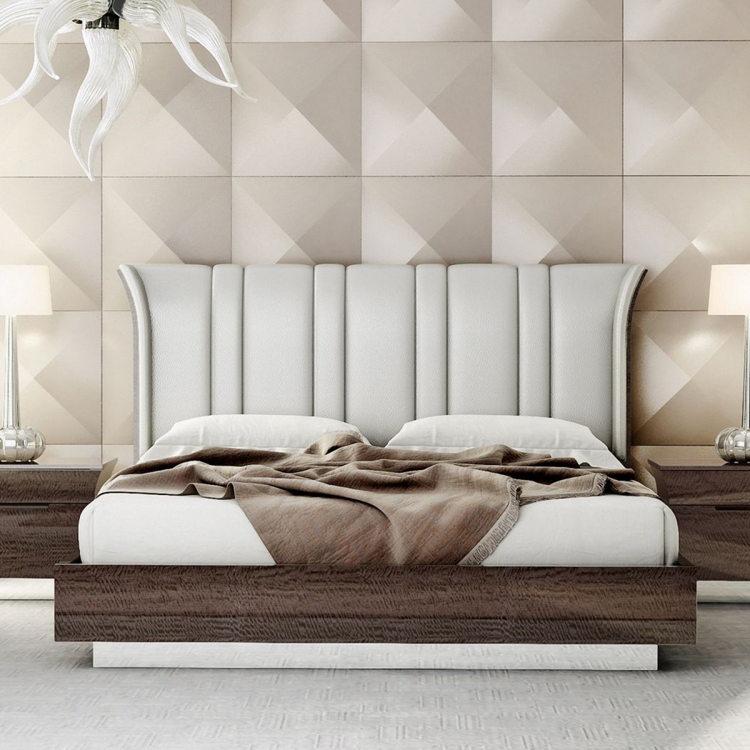 Спальня Kourtney выполнена в современном стиле, который визуально можно причислить и к стилю Арт-деко из-за интересной формы изголовья кровати, прикроватных тумбочек и комодов. Как и большинство актуальных тенденций современный стиль оформления помещений предполагает минимум мебели и аксессуаров. Основная задача — создать интерьер с ощущением незагруженного пространства, легкий и ненавязчивый. Отсюда и выбор предметов: они функциональны, линии лаконичны. Этот стиль для тех, кто устал от многообразия сложных форм. Kourtney выполнена в цвете темный каштан . Все ящики оснащены системой мягкого закрывания.