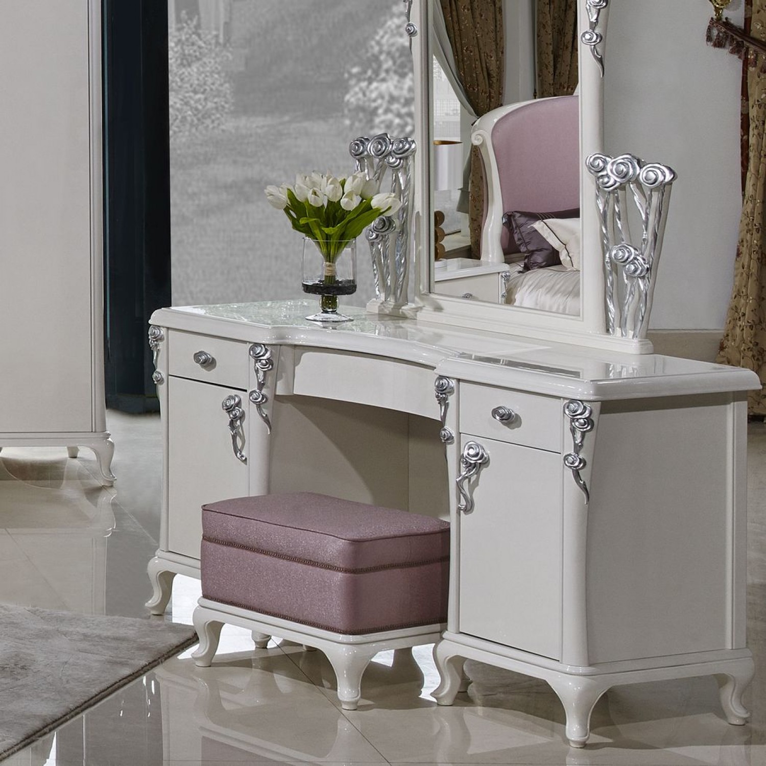 Спальня Sharlyn выполнена в стиле Ар-нуво. Стиль ар-нуво – это воздержание от прямых линий и углов, использование в дизайне «треугольных роз», которые являются визитной карточкой коллекции! Р астительный мир, флористический орнамент стали ключевыми элементами ар-нуво, его визиткой в мире искусства. Спальня Sharlyn выглядит исключительно натуральной, украшенной сложной резьбой. Изголовье кровати обтянуто тканью с серебрянной ниткой, что само-собой является украшением! Потрясающие резные элементы в зеркале и прикроватной кушетке создают в комнате эффект первозданной чистоты природы, не тронутой человеком и «солнце» ар-нуво непременно озарит и интерьер вашего дома с нашей спальней Sharlyn.