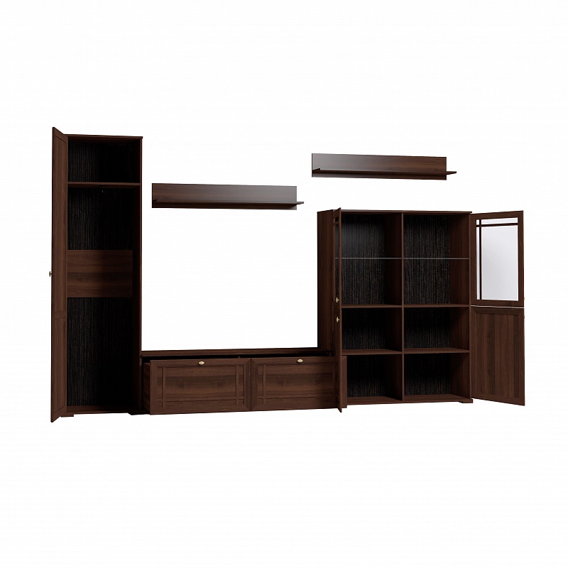 Этот многофункциональный модуль представляет собой цельное конструкторское решение и не разделяется на отдельные элементы. В него входит шкаф для одежды с выдвижной штангой, тумба под ТВ, квадратный буфет и две навесные полки. Глубокие выдвижные ящики тумбы оснащены технологичными телескопическими шариковыми направляющими и выдерживают нагрузку до 20 кг. Нишу под ТВ можно доукомплектовать Sherlock 17 Подставка , чтобы разместить аудио и видео аппаратуру. Габариты ниши по ширине - 1522 мм. Тонированное стекло на фасадах буфета делает мебель уютнее. Стеклянные полки толщиной 6 мм можно отрегулировать по высоте и поставить, например, высокую фарфоровую вазу. В нижнем отсеке посудного шкафа с полками из ЛДСП можно хранить книги.
