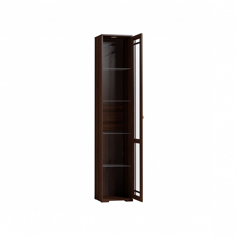 Витрина в гостиной означает, что хозяева любят и ценят семейные традиции. В ней можно выставлять не только посуду, но и фотографии, совместно приобретенные сувениры, красивые интерьерные мелочи или детские поделки. На стеклянных полках толщиной 4 мм с еврокромкой можно разместить любые вещи весом до 10 кг. Встроенная подсветка поможет создать необходимую атмосферу и создать акценты для внимания гостей. Она оснащена трансформатором и подключается к бытовой электросети 220 В. Благодаря переплету из тонкого профиля МДФ дверь не перенавешивается на другую сторону. Для открывания налево (петли слева) выбирайте Sherlock 13 Шкаф для посуды .