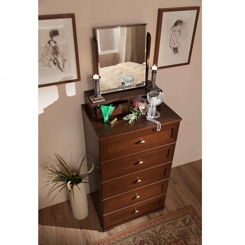 Высокий комод в гостиную , спальню или прихожую с пятью ящиками на шариковых направляющих позволит рационально использовать площадь комнаты. Повесьте над ним Sherlock 7 Зеркало или установите Sherlock 55 Трюмо с ящиками - и эргономичный вариант туалетного столика готов. Ящики глубиной 16 см выдерживают нагрузку до 20 кг каждый.