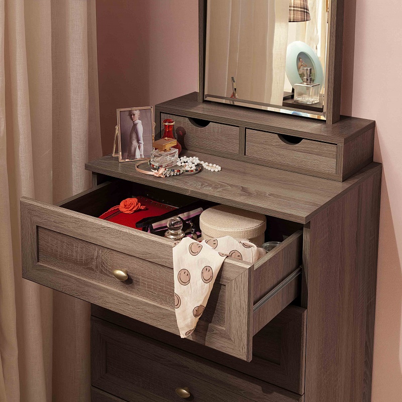 Высокий комод в спальню или в гостиную с пятью ящиками на шариковых направляющих позволит рационально использовать площадь комнаты. Повесьте над ним Sherlock 7 Зеркало или установите Sherlock 55 Трюмо с ящиками - и эргономичный вариант туалетного столика готов. Ящики глубиной 16 см выдерживают нагрузку до 20 кг каждый.