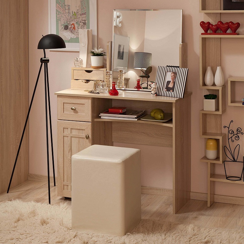 Туалетный столик с тумбой и выдвижным ящиком - самый удобный, вместительный и при этом скромный по габаритам вариант. Небольшой ящик на шариковых направляющих полного выдвижения. Они обеспечивают максимальный доступ к содержимому ящика и плавность его хода. Количество ящиков можно увеличить: установить на столешницу Sherlock 54 Ящики . За рамочным фасадом просторная ниша с полкой, регулируемой по высоте. Полка под столешницей с фигурным вырезом позволит комфортно сидеть за столиком человеку высокого роста. Сам по себе туалетный стол соответствует по высоте нормам ГОСТ и может использоваться как письменный или для работы с ноутбуком. Зеркало докупается отдельно, можно выбрать любое из имеющихся в коллекции Sherlock вариантов: навесное - Sherlock 7 Зеркало или стационарное - Sherlock 56 Трюмо и Sherlock 55 Трюмо с ящиками .