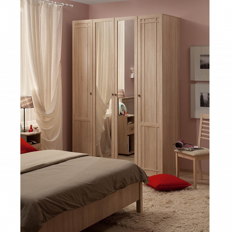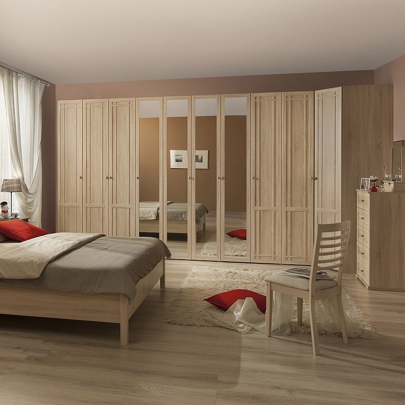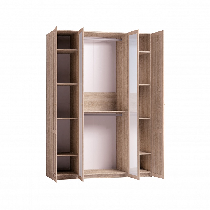 Вместительный четырехдверный Шкаф для одежды и белья с зеркалами во весь рост – уже зарекомендовал себя как отличный, продуманный по внутреннему наполнению и функционалу модуль. Глухие фасады шкафа декорированы раскладкой, центральные зеркальные рамочные фасады без раскладки. Боковые отсеки комплектуются 4 полочками, которые легко закрепить на нужной высоте. Две стационарные штанги в центральной части шкафа также можно перевешивать: для двух штанг предусмотрены три варианта присадки. Это поможет рассортировать длинную и короткую одежду на плечиках. Возможность перевешивать двери позволят создать современную компоновку из нескольких шкафов во всю стену - альтернативу шкафам-купе. Этот шкаф входит в программу Ширина ВРАЗМЕР , а это значит, что его ширину можно увеличить или уменьшить на 150 мм с шагом в 1 мм. Это позволит разместить его точно в предусмотренное для него место в комнате и использовать всю площадь, до миллиметра!
