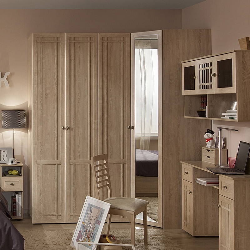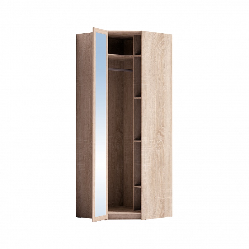 Угловой высокий шкаф использует рационально самую сложную площадь в комнате - угол. Он комплектуется внутренним стеллажом с регулируемыми по высоте полками и стационарной штангой для верхней одежды. Длина штанги 817 мм, что позволит свободно развесить более 10 плечиков с зимним гардеробом. Встроенная автоматическая подсветка поможет сориентироваться и быстро найти необходимое. Она включается только при открытой двери. Зеркальный фасад проклеен с тыльной стороны специальной пленкой, которая задержит падение осколков в том случае, если зеркало разобьется. Аккуратная рама из МДФ по периметру фасада не делит отражение и позволяет увидеть себя в полный рост без помех. Идентичный шкаф с глухим фасадом: Sherlock 63 Шкаф для одежды .