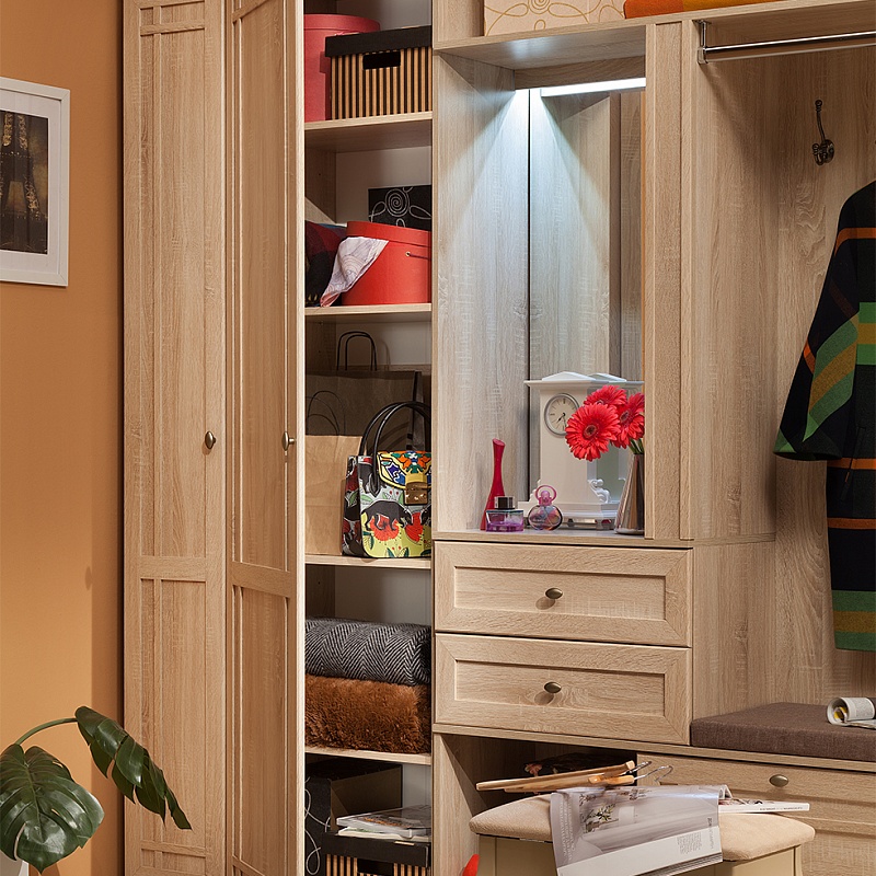 Это находка для маленькой прихожей. В небольшом по габаритам модуле сочетается всё необходимое: вешалки и крючки, полки и отделения за глухими фасадами, предусмотрено зеркало с подсветкой. Стационарная штанга на подвесах добавит вешалке Шкафа МЦН функциональности. Штанга на подвесах выдерживает нагрузку до 15 кг. Встроенная светодиодная подсветка включается при помощи аккуратного кнопочного выключателя. В модуле Шкаф МЦН предусмотрено место для хранения коробок и домашней обуви — просторная открытая ниша и ниша с полочкой за откидной дверцей на шарнирах. Дверца дополнительно фиксируется при закрывании магнитной защелкой. Регулируемые опоры помогут компенсировать неровный пол в прихожей. Ящик под аксессуары и косметику оснащен шариковыми направляющими полного выдвижения, что увеличивает полезную площадь ящика. Мягкое сидение, которое входит в комплектацию модуля, позволит обуваться с комфортом и сэкономить место в прихожей. Сборка Шкаф МЦН универсальная — его можно собрать как на правую, так и на левую сторону.