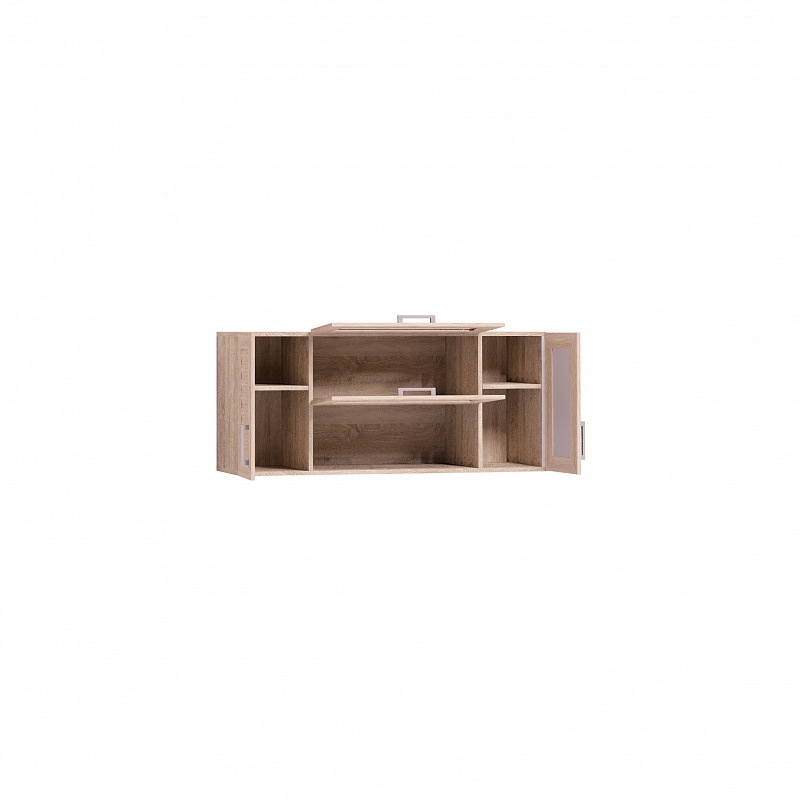 4 Шкаф навесной навешивается на любой удобной высоте, для этого конструкция шкафа предусматривает наличие специальных подвесов. Его можно закрепить между шкафами или навесить отдельно. Сквозь рамочные стеклянные фасады, которые открываются за ручку вверх, будут видны интерьерные мелочи и посуда.